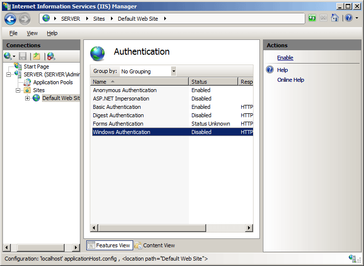 - Expand Internet Information Services, expand World Wide Web Services, expand Security, and then select Windows Authentication.