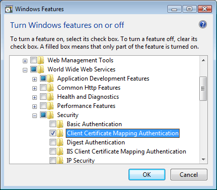 - IIS Client Certificate Mapping authentication - this method of authentication does not require Active Directory and therefore works with standalone servers. This method of client certificate authentication has increased performance, but required more configuration and requires access to client certificates in order to create mappings.