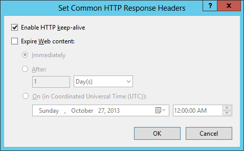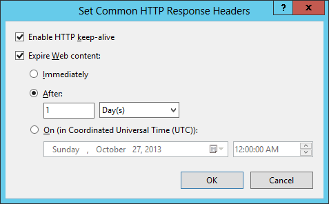 5. In the Set Common HTTP Response Headers dialog box, check the box to expire Web content, select the option to expire after a specific interval or at a specific time, and then click OK.