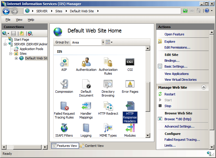 Screenshot that shows the Default Web Site Home pane. H T T P Response Headers is selected.
