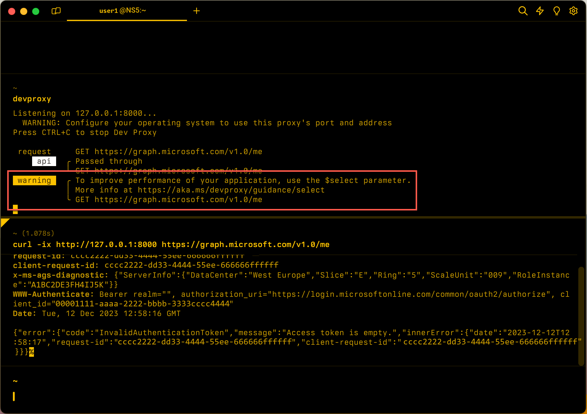 Shows a warning when proxy intercepts a request to Microsoft Graph APIs that doesn't include the $select query string parameter.