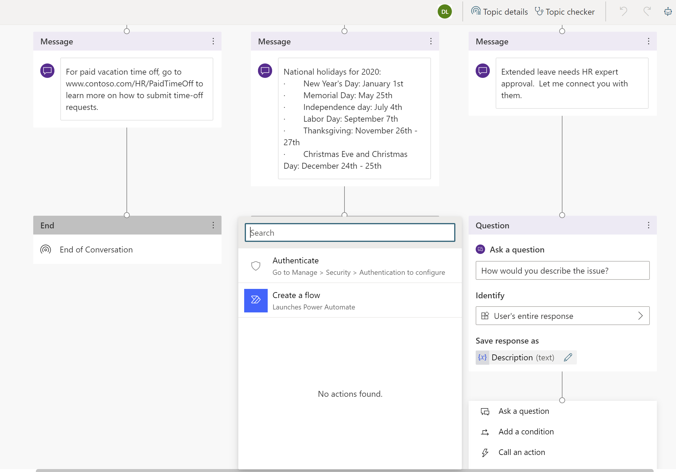 A chatbot comes with a collection of topics that defines how it interacts with users. Let's build a topic to answer employee questions about taking time off.