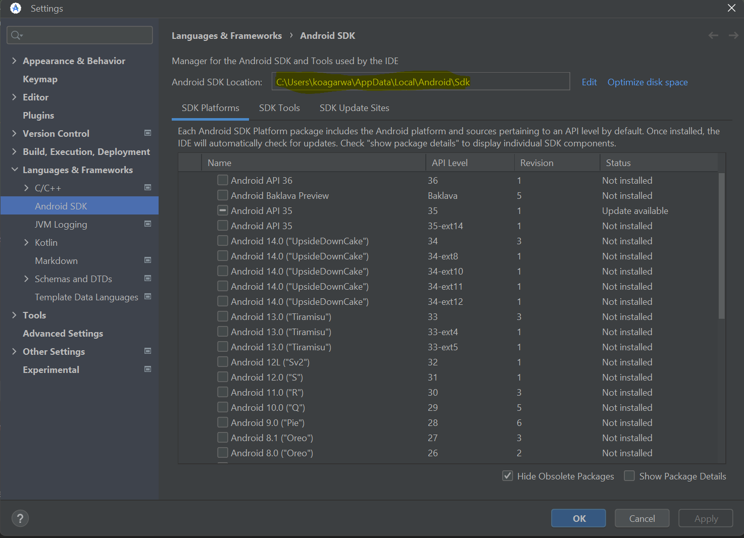 - Go to Tools > SDK Manager > Android SDK Location to find your SDK path.