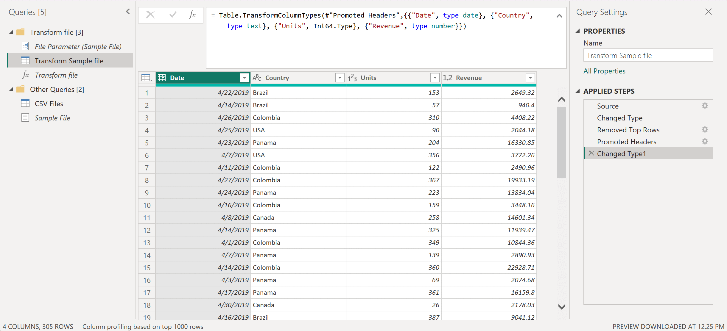 After promoting your column headers, Power Query by default automatically adds a new Changed Type step that automatically detects the data types for each column. Your Transform Sample file query looks like the next image.