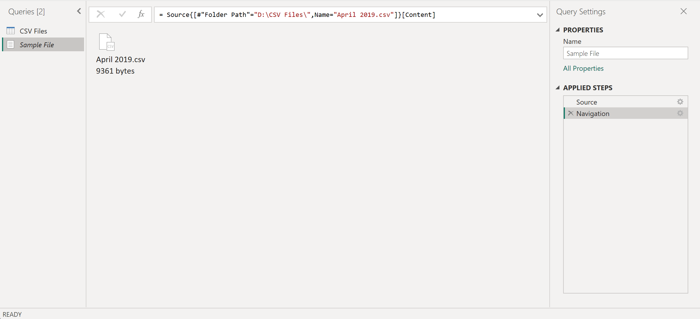 This option effectively creates a new query with a navigation step directly to that file as a Binary, and the name of this new query is the file path of the selected file. Rename this query to be Sample File.
