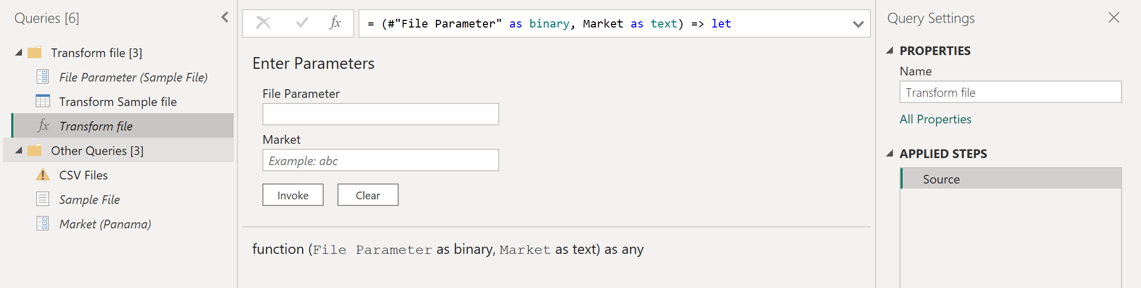Applying this new step to your query automatically updates the Transform file function, which now requires two parameters based on the two parameters that your Transform Sample file uses.