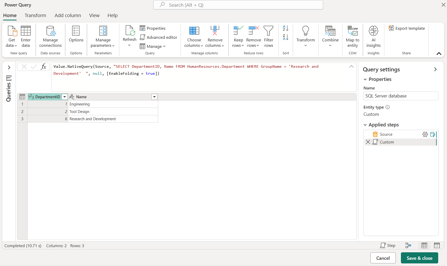 Value.NativeQuery(Source, "SELECT DepartmentID, Name FROM HumanResources.Department WHERE GroupName = 'Research and Development' ", null, [EnableFolding = true])