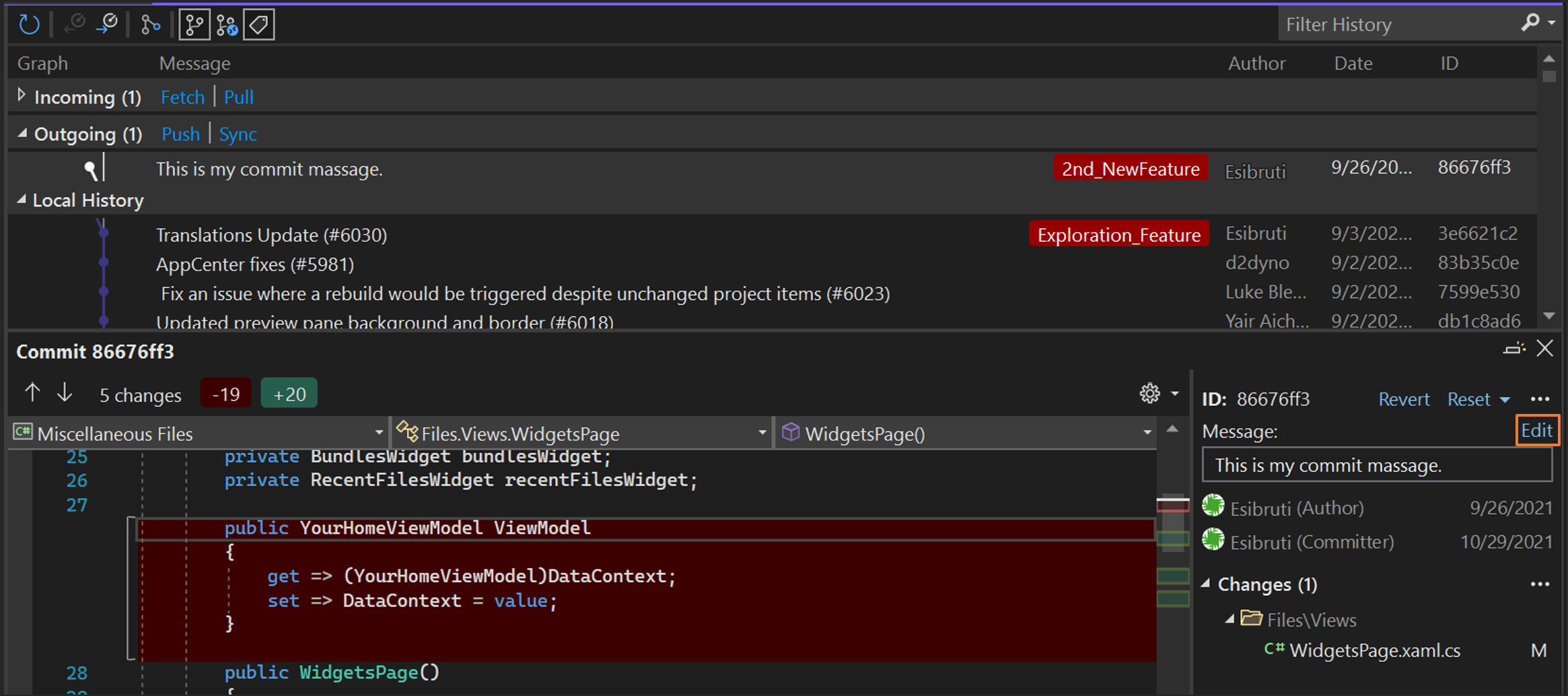In the previous example, the commands will undo the changes made in commit 53333305 and create a new commit on the branch. The original commit is still in the Git history. To do the same in Visual Studio, right-click the commit you want to revert and then select Revert. After you confirm your action and the operation is complete, Visual Studio displays a success message and a new commit appears in the Outgoing section.