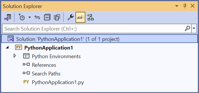 Visual Studio creates the project and opens it in Solution Explorer. If you want to move the .pyproj file to a different location, select the file in Solution Explorer, and then select File > Save As on the toolbar. This action updates file references in the project, but it doesn't move any code files.