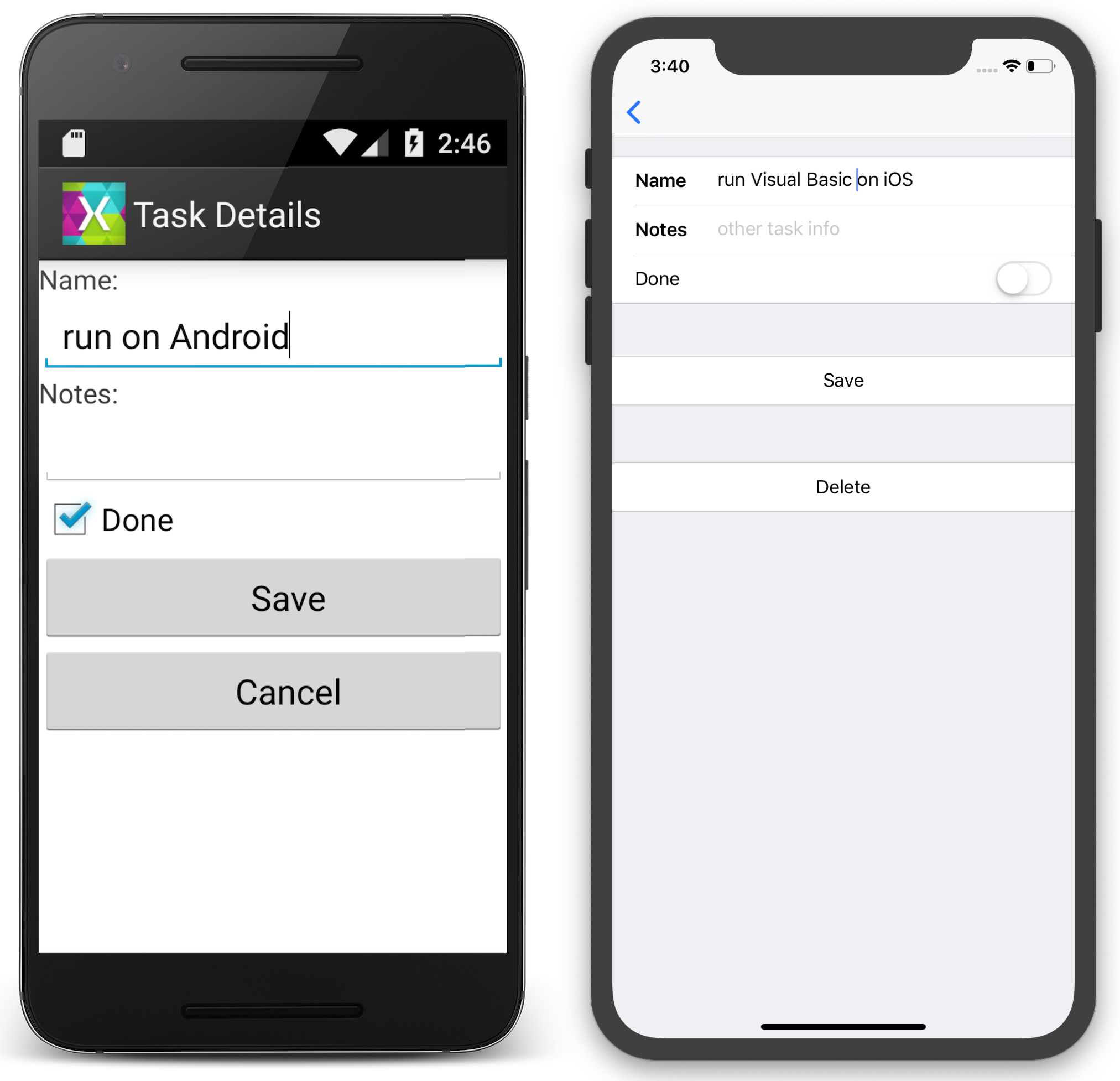 The Android and iOS projects in the example are all written in C#. The user interface for each application is built with native technologies, while the TodoItem management is provided by the Visual Basic .NET Standard library using an XML file (for demonstration purposes, not a full database).