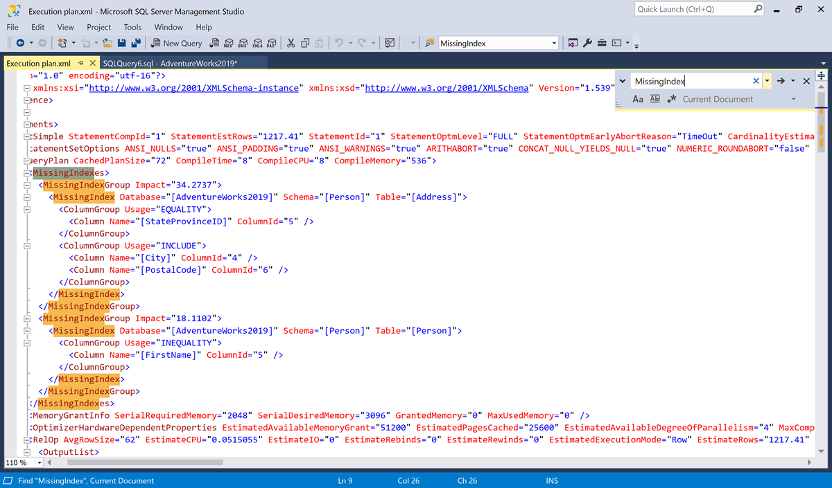 MissingIndexeselement in the XML of execution plans. This allows you to correlate indexes that the query optimizer considers missing with the queries for which they are missing. - A set of dynamic management views (DMVs) that can be queried to return information about missing indexes. This allows you to view all of the missing index recommendations for a database.