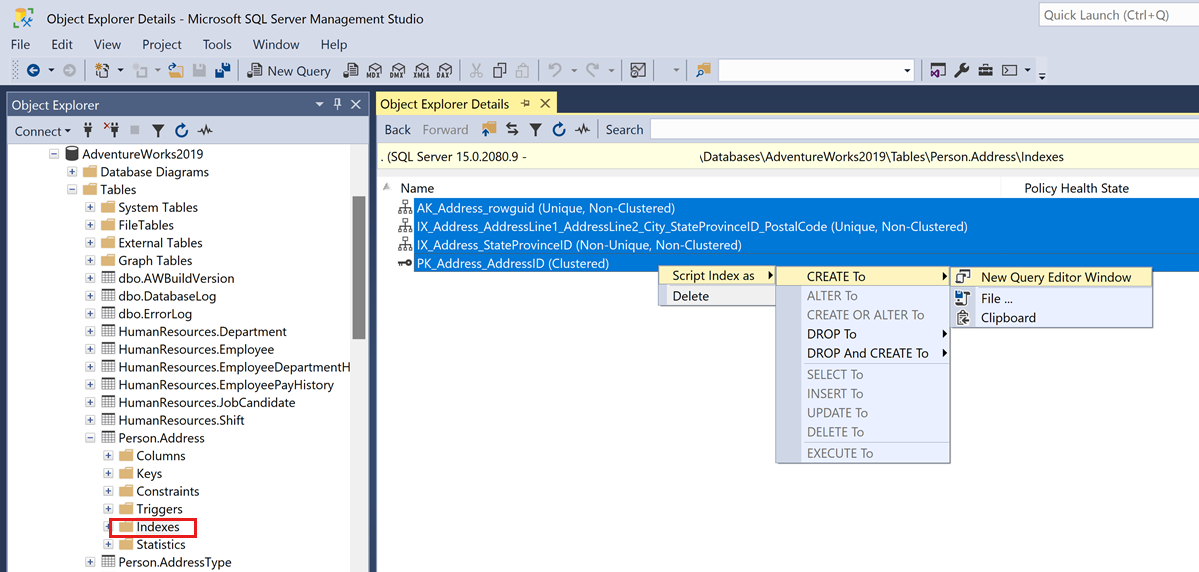 - Select all indexes listed on the Object Explorer Details pane with the shortcut CTRL+a.