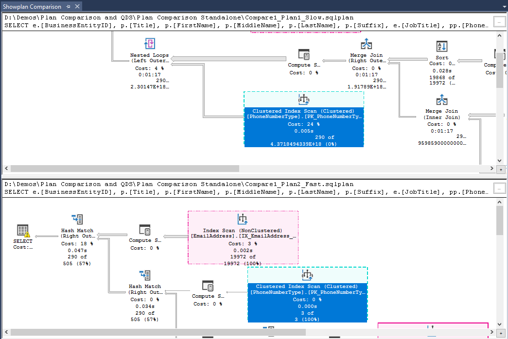 Choose the second query plan file that you would like to compare with. The second file opens so that you can compare the plans.