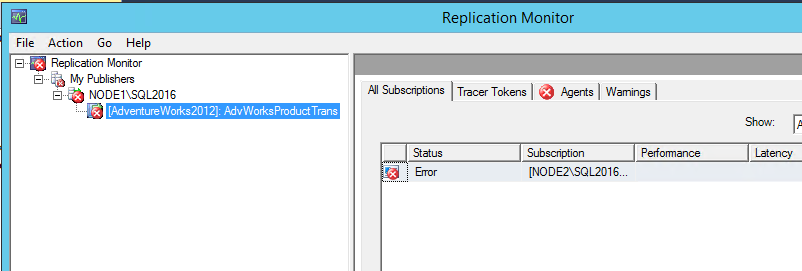 7. Check Replication Monitor again, by right-clicking Replication in Object Explorer. A red X under All Subscriptions indicates that the Distribution Agent is still encountering an error.