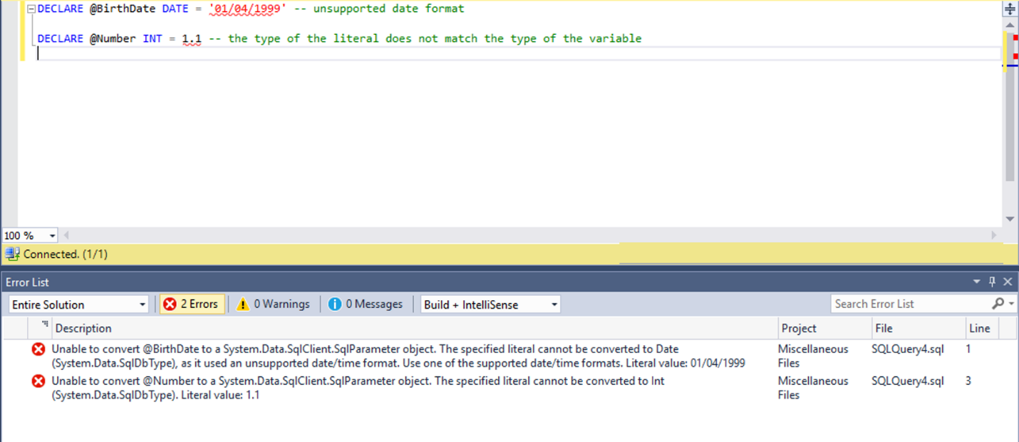 DECLARE @Number int = 1.1 -- the type of the literal does not match the type of the variable