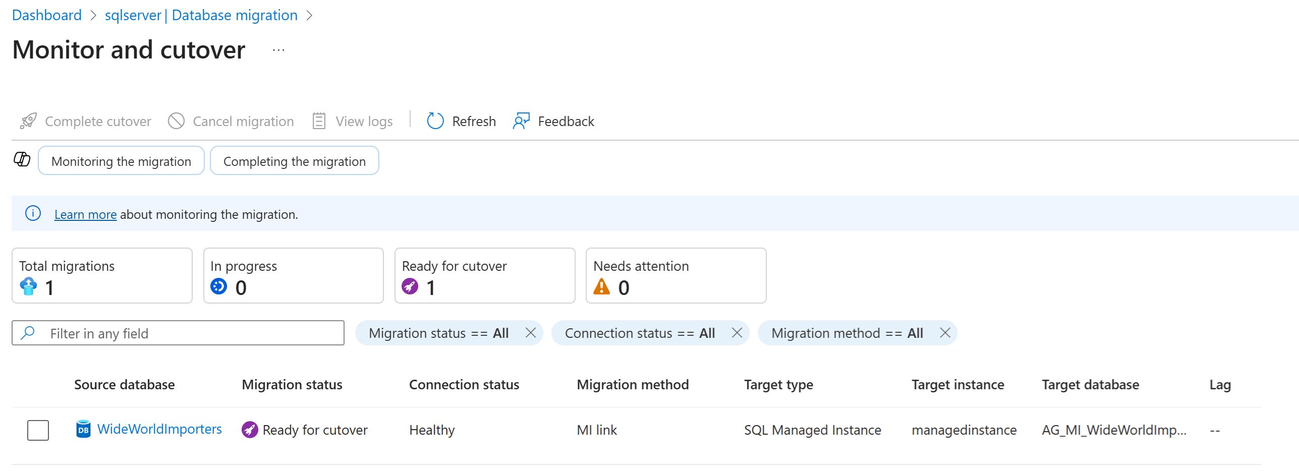 You can complete or cancel the migration from the Monitor and cutover pane. You can also view logs for information about the migration. Selecting a database takes you to a pane with more details about the source and target.