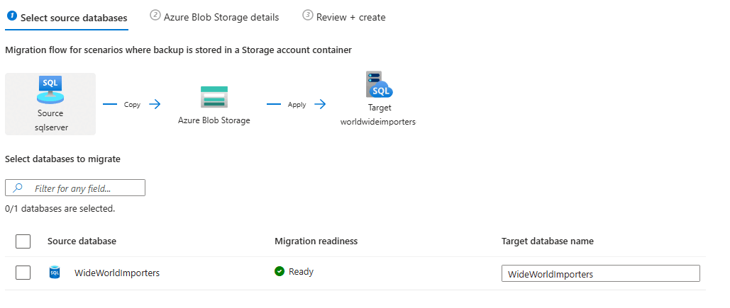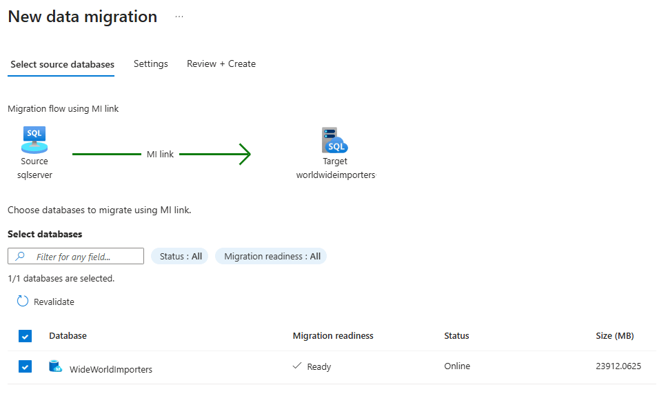 1. If you already have an instance as a target, choosing Select target takes you to the Database migration pane for your SQL Server instance. The instance name is populated as the selected target. Then you can proceed to the Migrate data step.