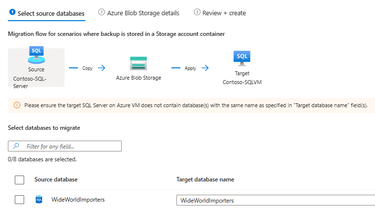 Selections on the New data migration page aren't available, or will error out, after you choose Migrate using backup and restore (preview) unless the Azure Blob Storage account has at least one single full backup, and permissions are correctly set.