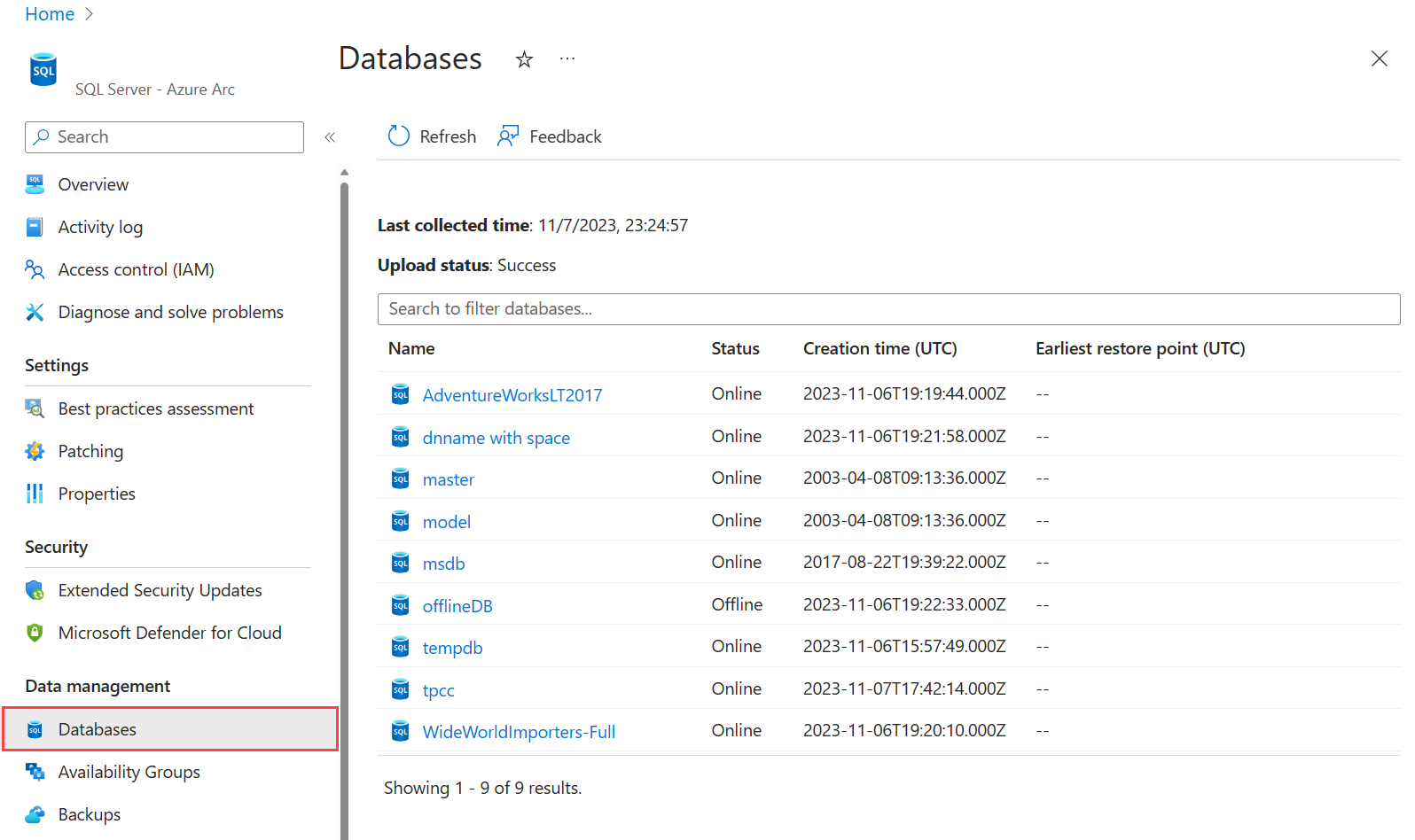 4. Use the SQL Server databases - Azure Arc area to view the databases that belong to the instance.