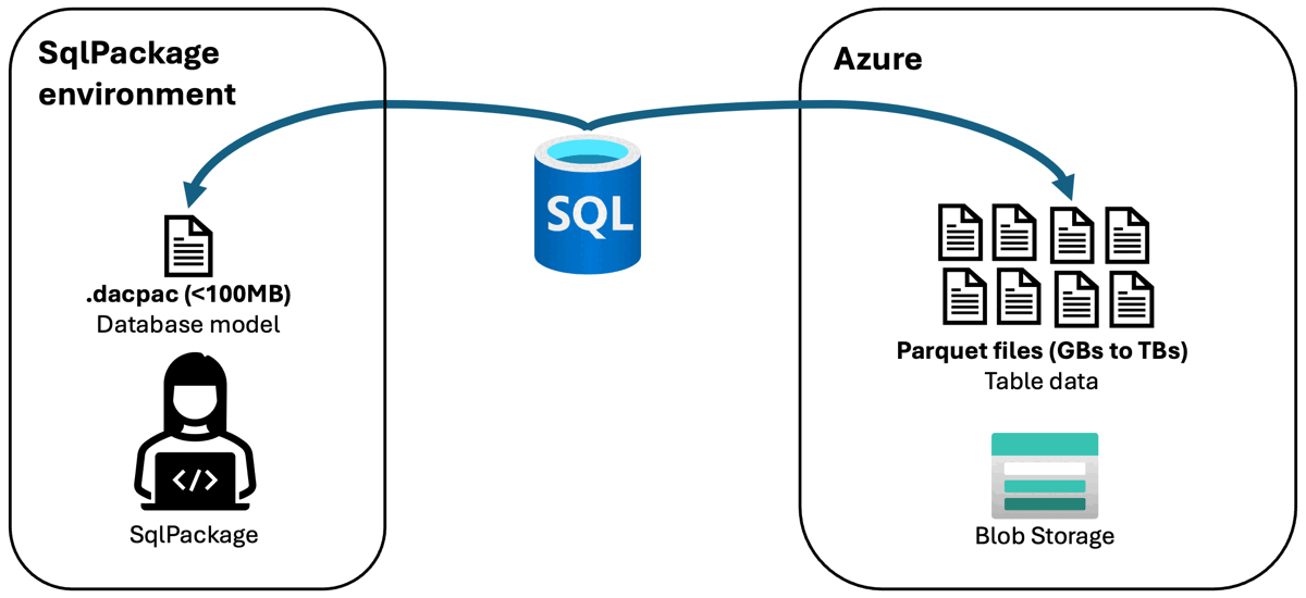 With publish, the database schema (.dacpac file) is read from the local client running SqlPackage and the data is read from or written to Azure Blob Storage in Parquet format.