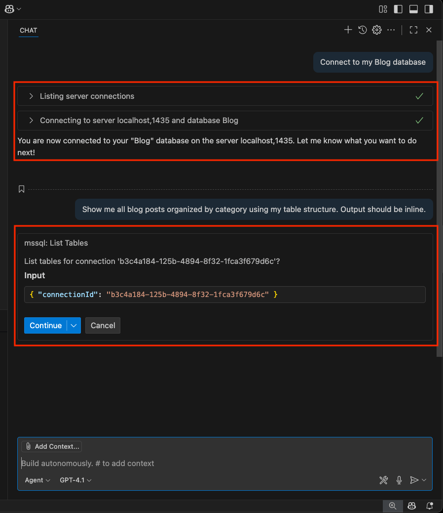 You can also use chat variables like #mssql_connect to invoke these tools directly, or write prompts in natural language such as: