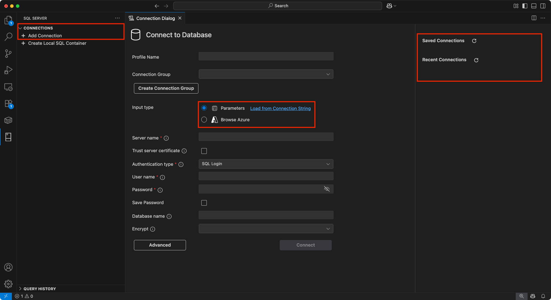 As an alternative, you can enter the ADO connection string for your database here.Trust Server Certificate Check this field. Select this option to trust the server certificate. Input type Parameter. Choose from Parameter, Connection String, or Browse Azure. Database name (optional) <Default>. The database that you want to use. To connect to the default database, don't specify a database name here. Authentication Type SQL login. Choose either SQL Login, Windows Authentication, or Microsoft Entra ID. User name Enter your <username> for the SQL Server. If you selected SQL Login, enter the name of a user with access to a database on the server. Password Enter your <password> for the SQL Server. Enter the password for the specified user. Save Password Check this field to save the password for future connections. Press Enter to select Yes and save the password. Select No to be prompted for the password each time the connection profile is used. Encrypt Mandatory. Choose from Yes, No, or Mandatory. After you enter all values and select Enter, Visual Studio Code creates the connection profile and connects to the SQL Server.