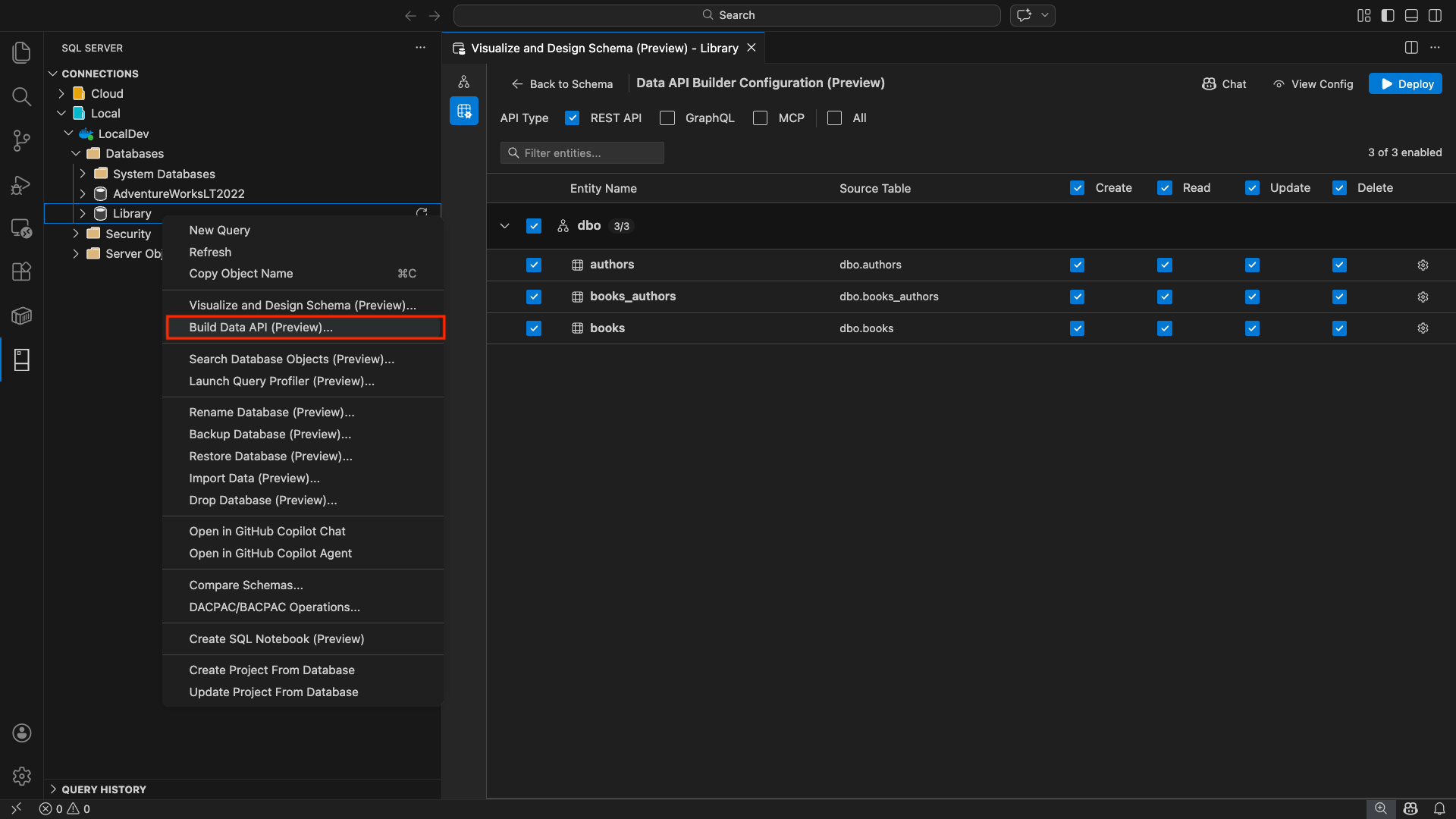 • From the Object Explorer: Right-click on a database node and select Build Data API (Preview)....