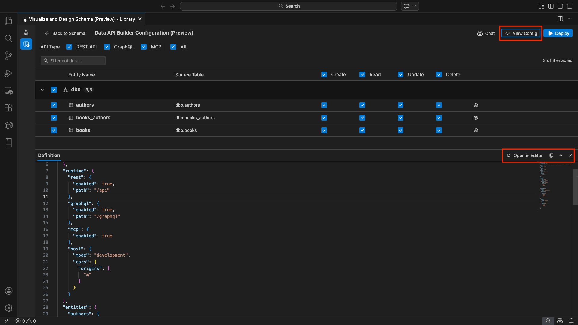 Select the View Config button in the toolbar to open the Definition panel at the bottom of the configuration view. This panel shows the generated Data API builder JSON configuration file in a read-only format.
