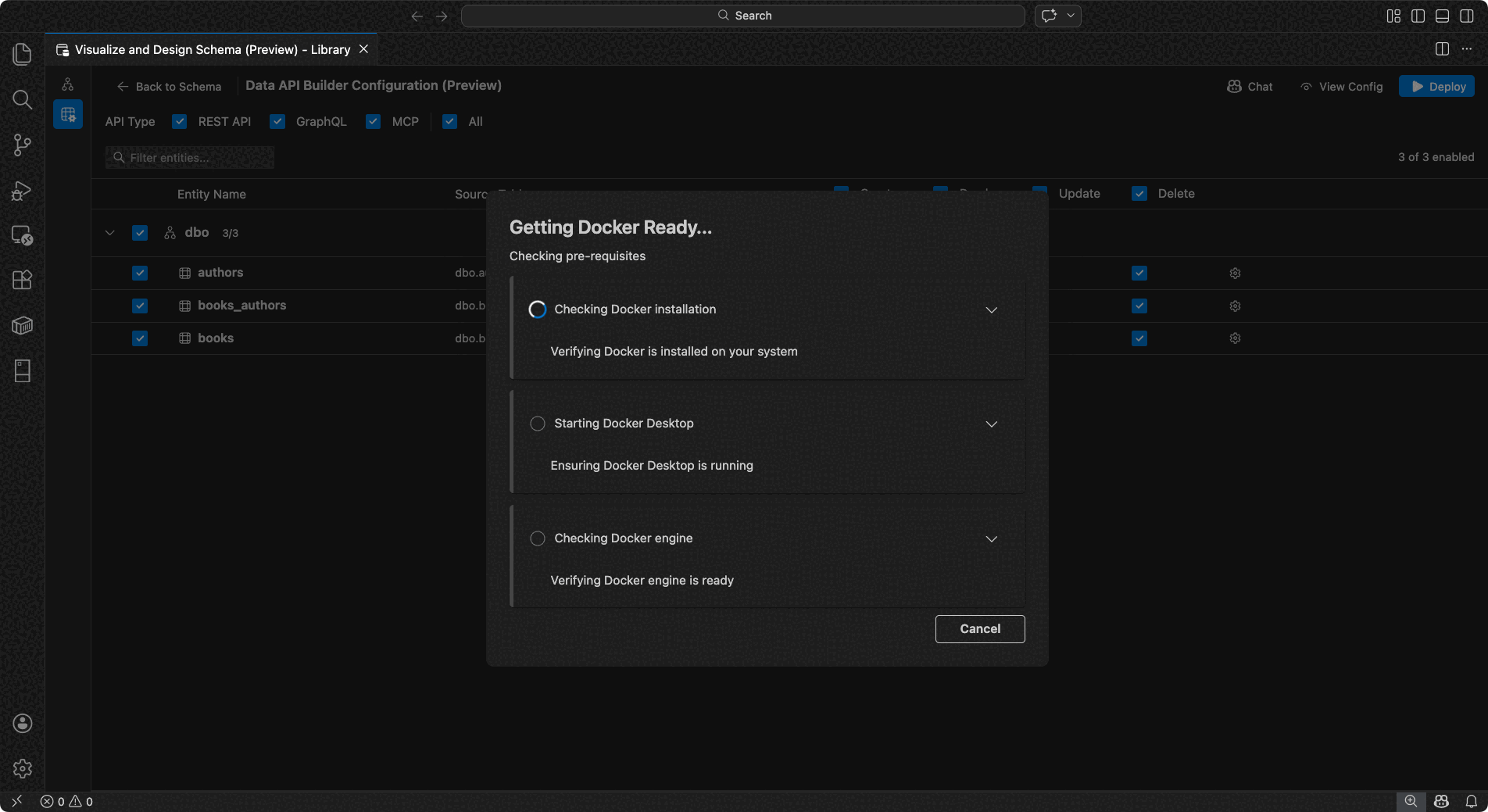 • Deploy Data API builder locally as a Docker container with automated prerequisite checks.