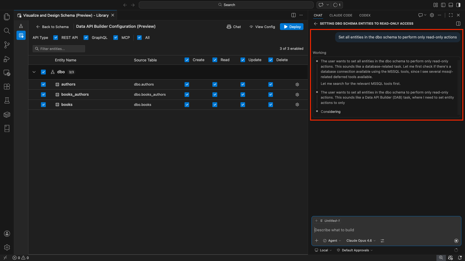 For developers who prefer natural language, GitHub Copilot is built into the Data API builder experience. Select the Chat button in the toolbar to open a GitHub Copilot chat session scoped to the Data API builder configuration context. GitHub Copilot and the UI stay in sync: changes made through chat are immediately reflected in the UI and vice versa.