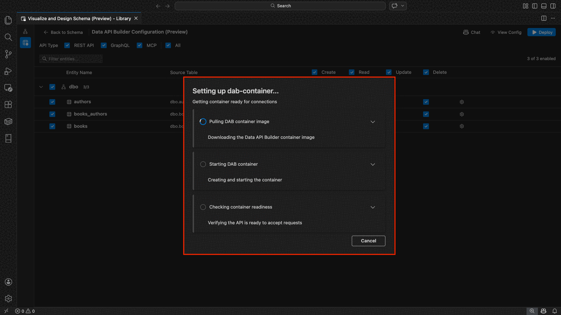 The MSSQL extension for Visual Studio Code includes an integrated UI for Data API builder, so you can create REST, GraphQL, and MCP endpoints for your SQL database tables without writing configuration files or leaving Visual Studio Code. You can select which tables to expose, configure CRUD permissions, choose API types, preview the generated configuration, and deploy a local backend powered by Data API builder, all from a visual interface.