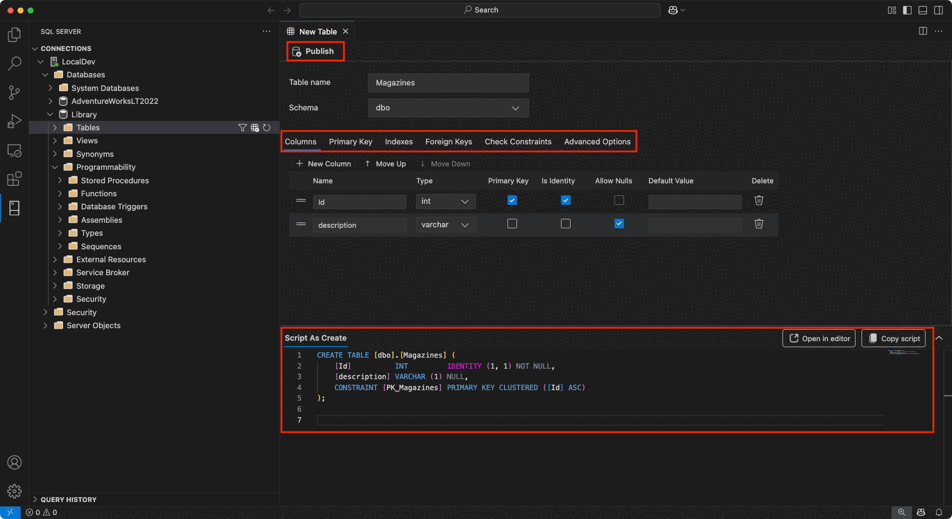 Publish: Apply your changes directly to the database by selecting Publish. This action uses DacFX (Data-tier Application Framework) to deploy your schema updates.