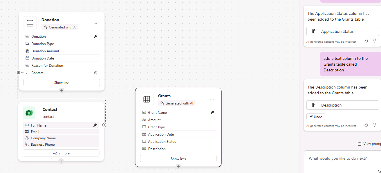 Copilot should only create one table called Donation. If more were created, you can delete them, by telling Copilot the name of the table to delete.