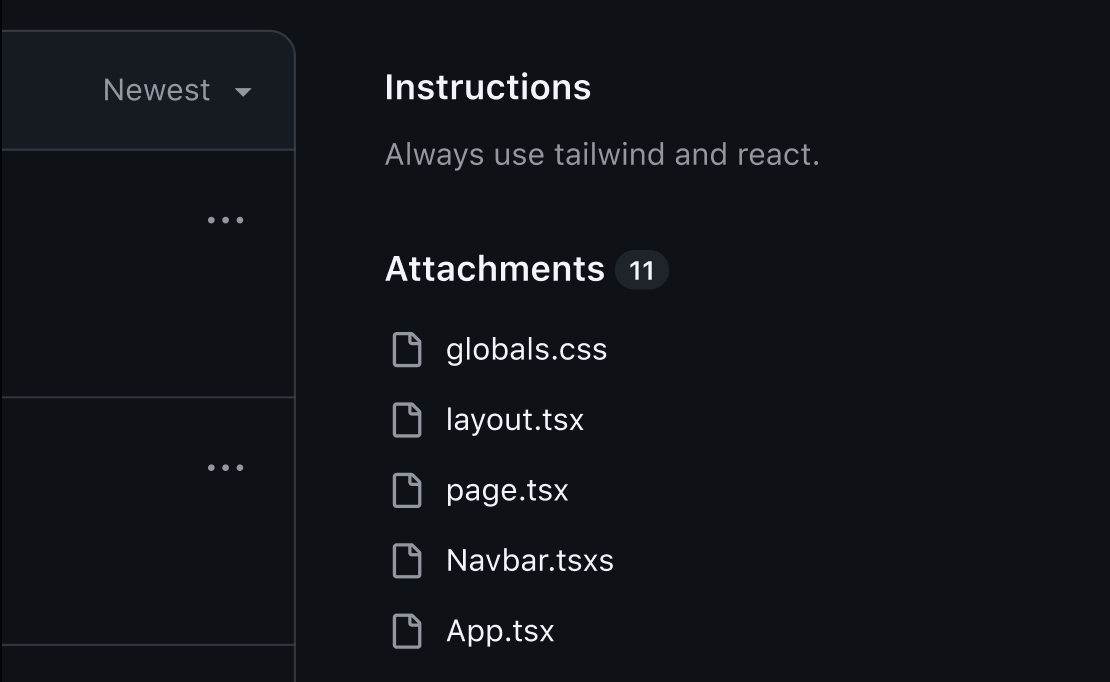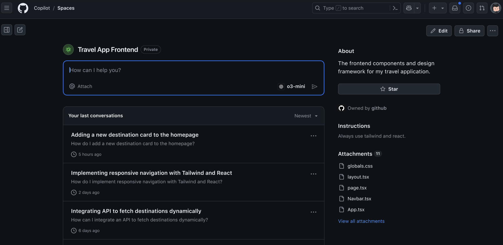 - You can attach source code files, markdown docs, configuration files, or other assets as context. These files are referenced from the default branch, so your Space stays up to date as your repo evolves.