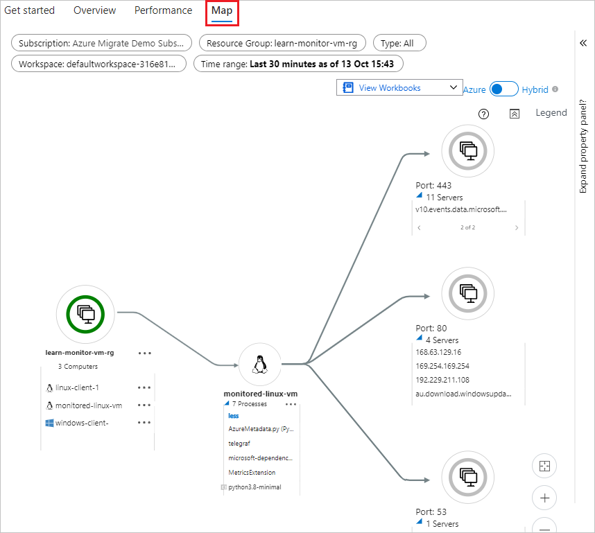 If enabled earlier, select the Map tab on the Insights page to see the workbook for the Map feature. The map visualizes the VM's dependencies by discovering running process groups and processes that have active network connections over a specified time range.