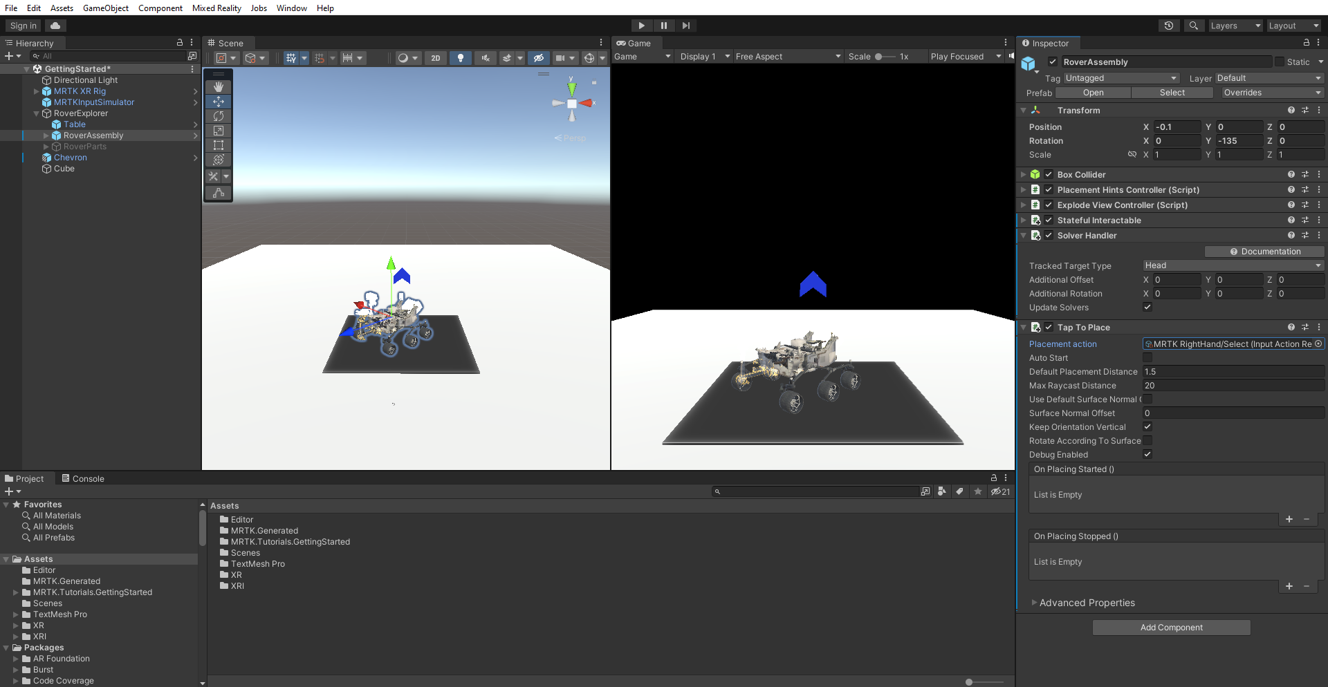 In the Hierarchy window, select the RoverExplorer > RoverAssembly object. Then, in Inspector, use Add Component to add the Tap To Place component. Configure the component as follows: