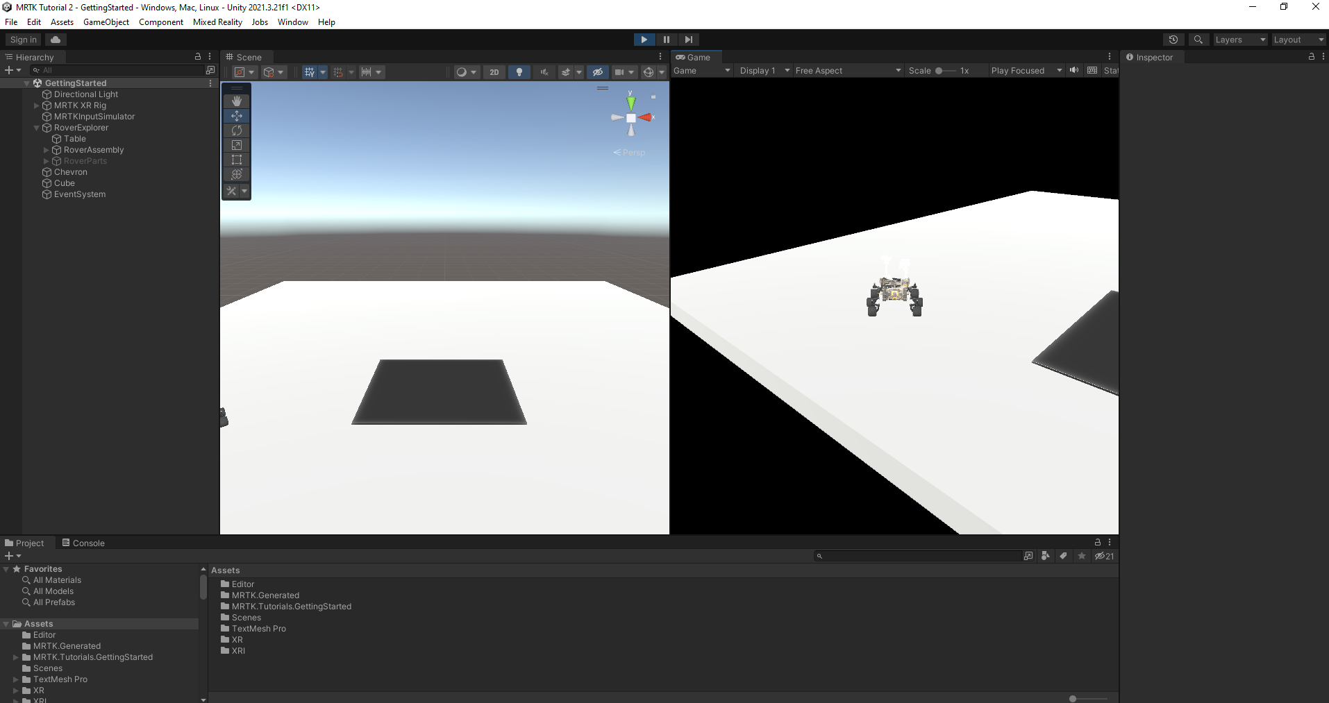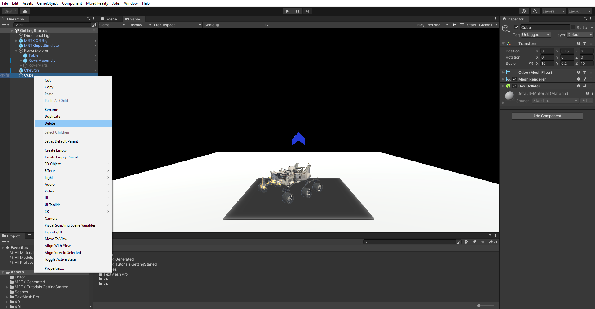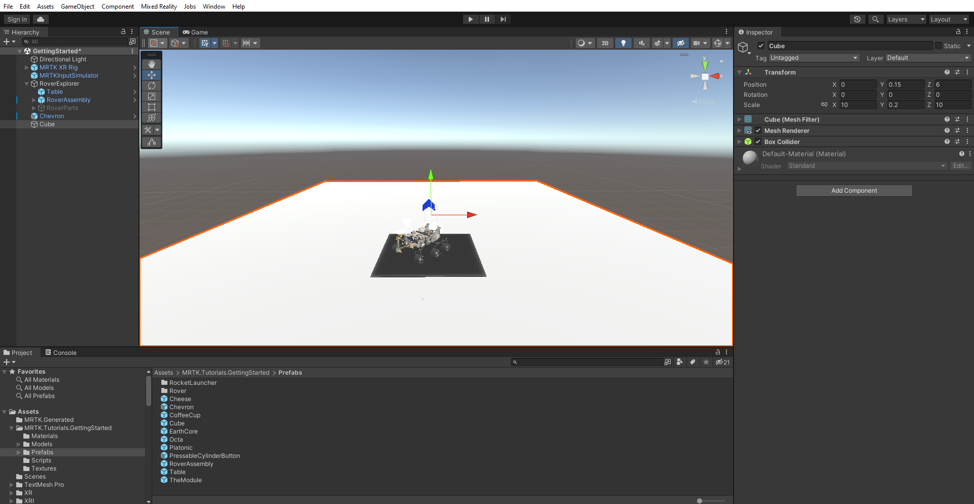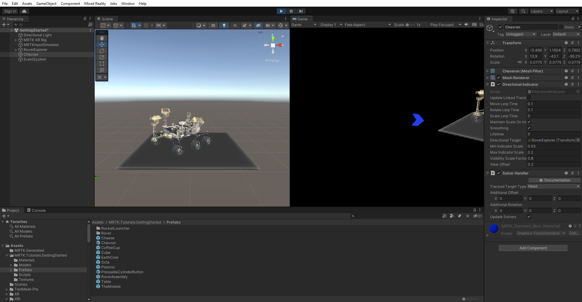 In the Project window, go to Assets > MRTK.Tutorials.GettingStarted > Prefabs. Drag the Chevron prefab into the Hierarchy window, and set its Transform Position to X = 0, Y = 1.5, Z = 2 to position it near the RoverExplorer object.