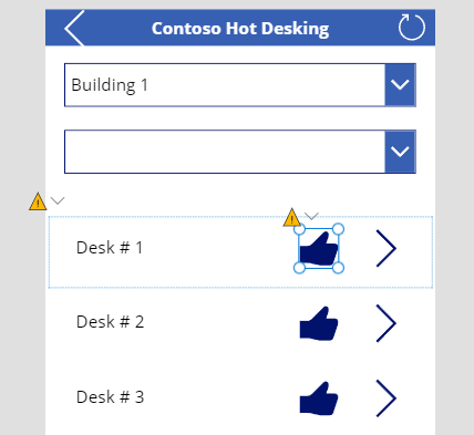 Select the icon that you added and change the Icon value to the following formula. This formula shows the thumbs up icon filled if the user didn't indicate this desk as a favorite, or it shows the thumbs up icon if the user has already selected the desk as a favorite.