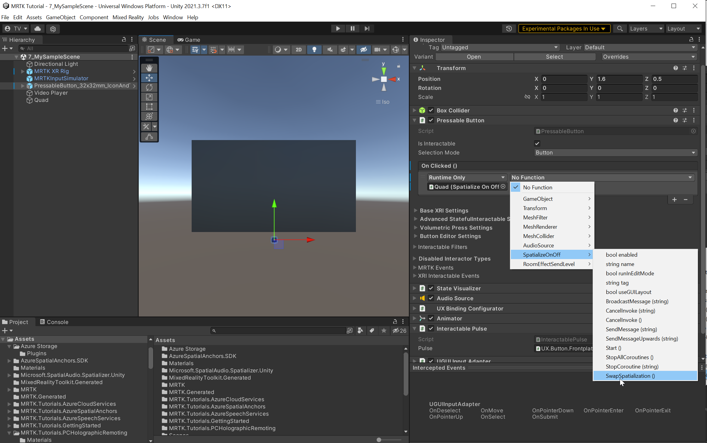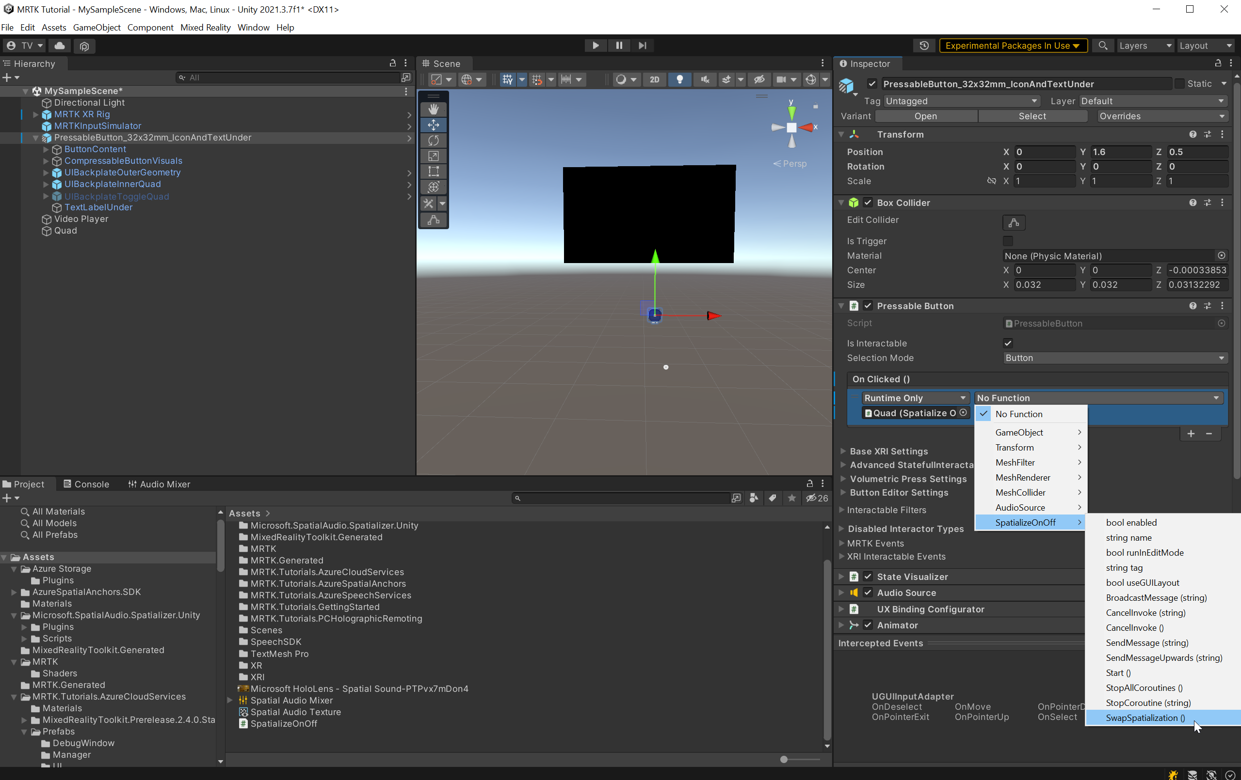 To set the button to call the SpatializeOnOff script when the button is released, you need to configure interactable script. In the Hierarchy window, select the PressableButton_32x32mm_IconAndTextUnder. In the Inspector window, locate the Pressable Button component and select the + icon under the OnClicked () event.