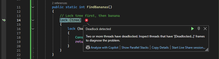 lockblocks the threads in theFindBananasmethod. One thread is waiting for the lock ontreeto be released by the other thread, but the other thread is waiting for the lock onbanana_bunchto be released before it can release the lock ontree. This is an example of a classic deadlock that occurs when two threads are waiting on each other.If you're using Copilot, you can also get AI-generated thread summaries to help identify potential deadlocks.