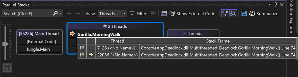 The sample code in this walkthrough is for an application that simulates a day in the life of a gorilla. The purpose of the exercise is to understand how to use the Threads view of the Parallel Stacks window to debug a multithreaded application.