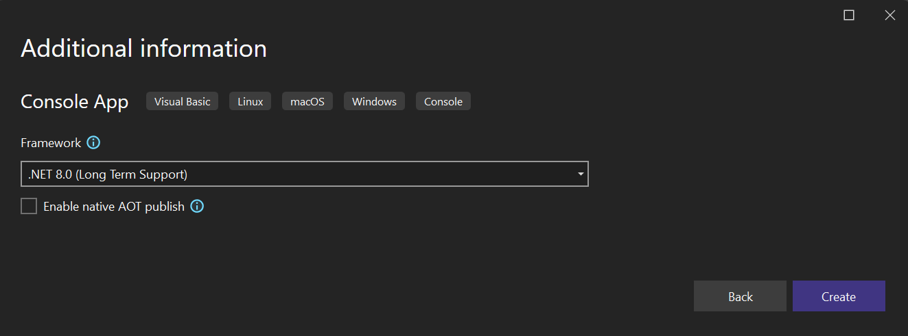 In the Additional information window, verify that .NET 8.0 appears in the Framework menu, and then select Create.