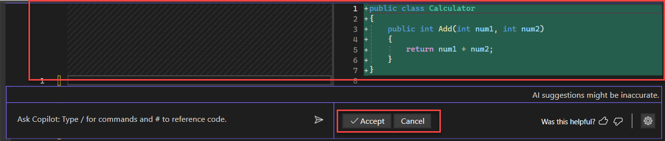 You see code suggestions from Copilot Chat in the diff view. You can review and refine what's being proposed. To apply the suggestions to your code, select Accept. To discard the suggestions, select Cancel.