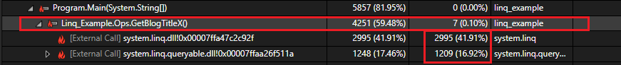 GetBlogTitleX makes external calls to two LINQ DLLs, which are using most of the CPU time, as evidenced by the very high Self CPU values. This is the first clue that a LINQ query might be an area to optimize.