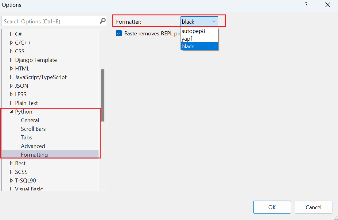 You can set your source code formatter through Tools > Options > Text Editor > Python > Formatting. Python Tools in Visual Studio support source code formatting with autopep8, Black formatter, and yapf.