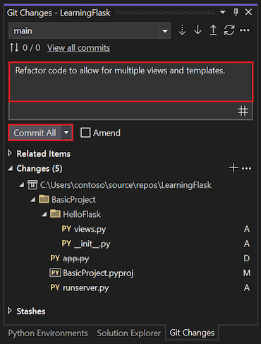 After you refactor the code and test the updates, you can review and commit your changes to source control: