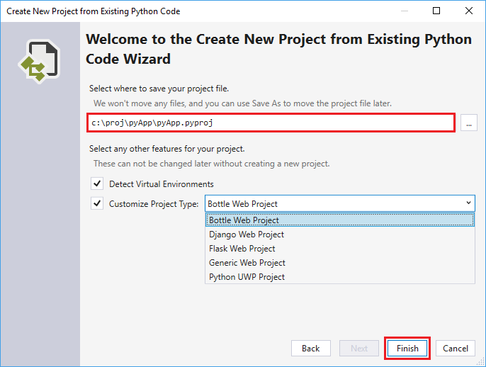 6. Select the location to store the project file (a .pyproj file on disk). If applicable, you can also include autodetection of virtual environments and customize the project for different web frameworks. If you're unsure of these options, leave the fields set to the defaults.