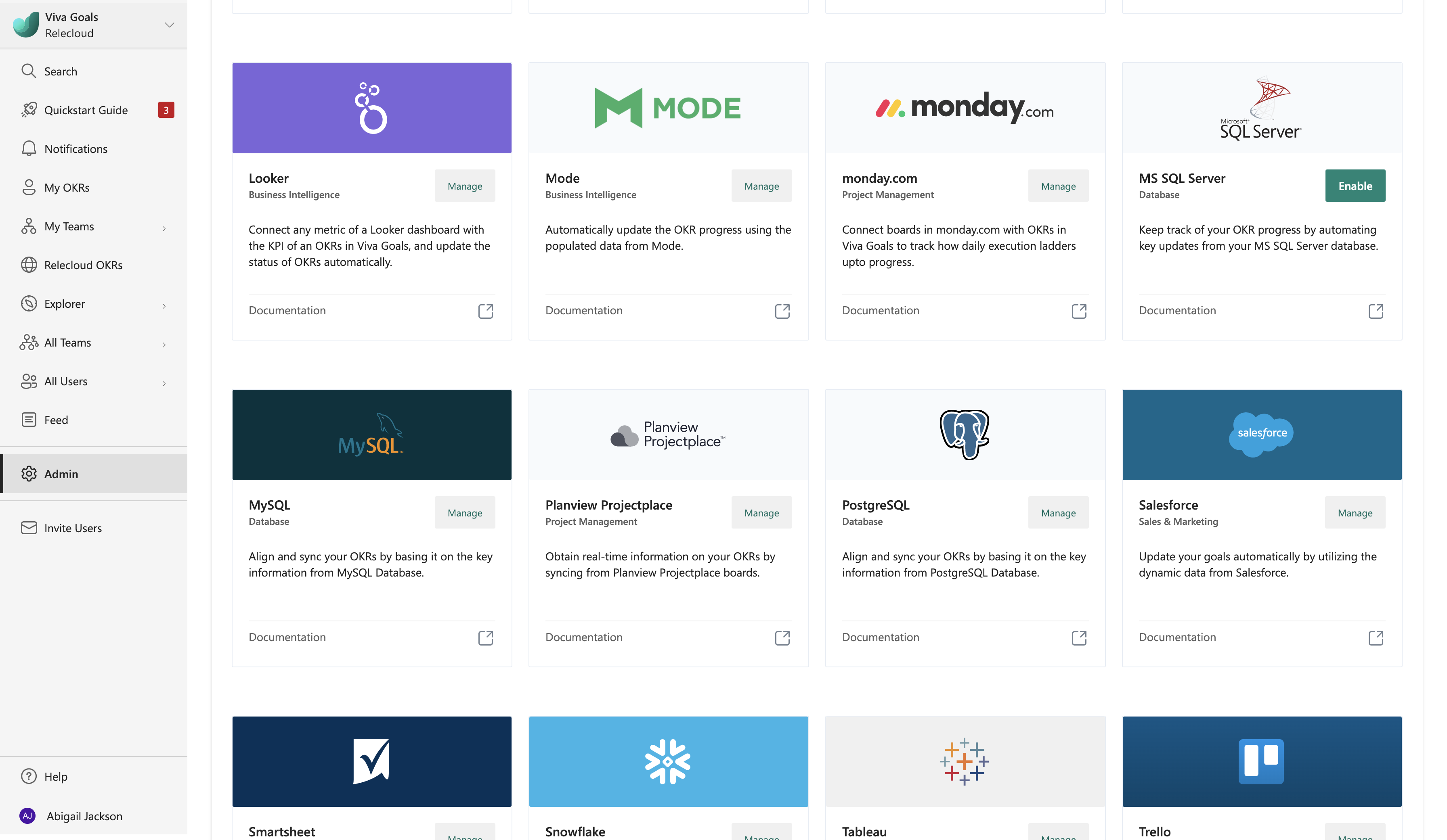 The first step to set up the Microsoft SQL integration is to connect your account to Viva Goals. Go to the sidebar and select Admin and then select Integrations.