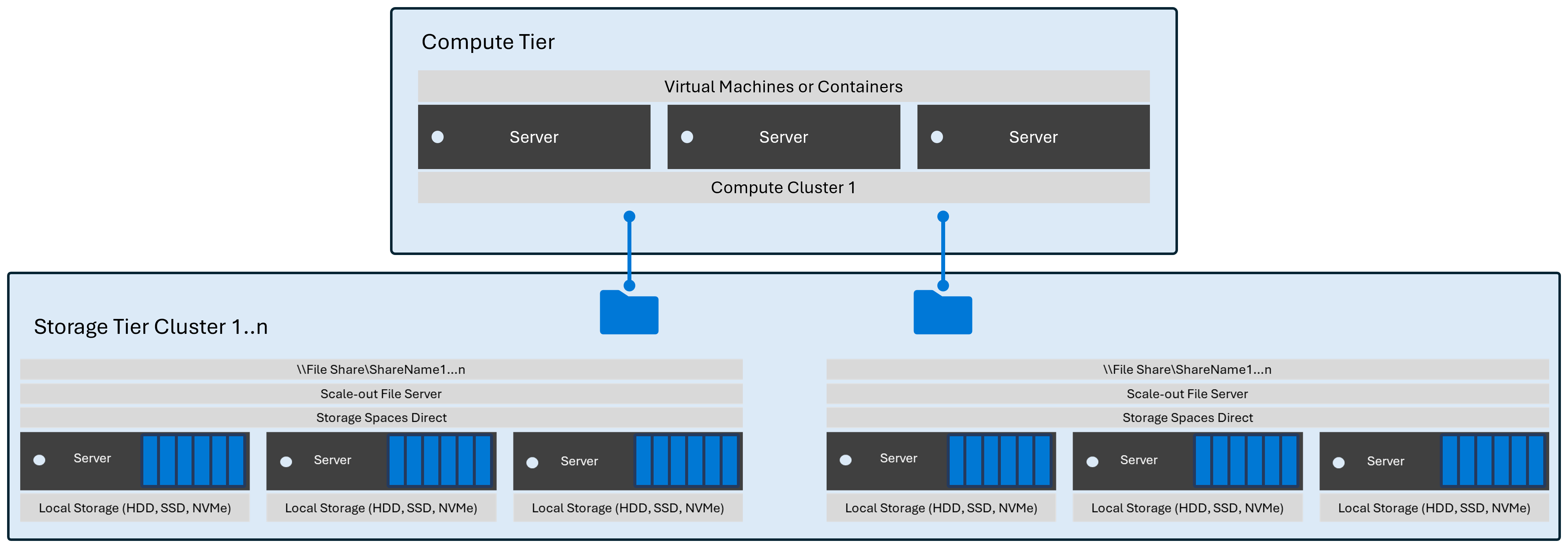 Disaggregated Storage Spaces Direct separates compute and storage into distinct clusters. A compute cluster (running workloads such as VMs, Scale-Out File Server roles, SQL Server databases, or containerized applications) accesses storage provided by a separate Storage Spaces Direct cluster over SMB 3.0.