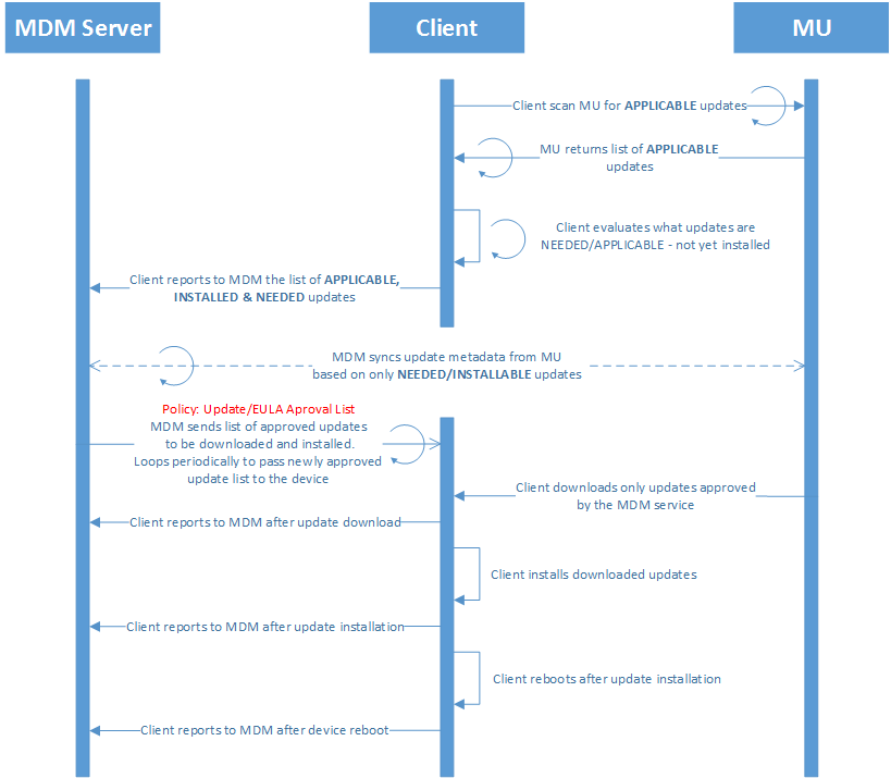 With PCs, tablets, phones, and IoT devices, Mobile Device Management (MDM) solutions are becoming prevalent as a lightweight device management technology. In Windows, we're investing heavily in extending the management capabilities available to MDMs. One key feature we're adding is the ability for MDMs to keep devices up to date with the latest Microsoft updates.
